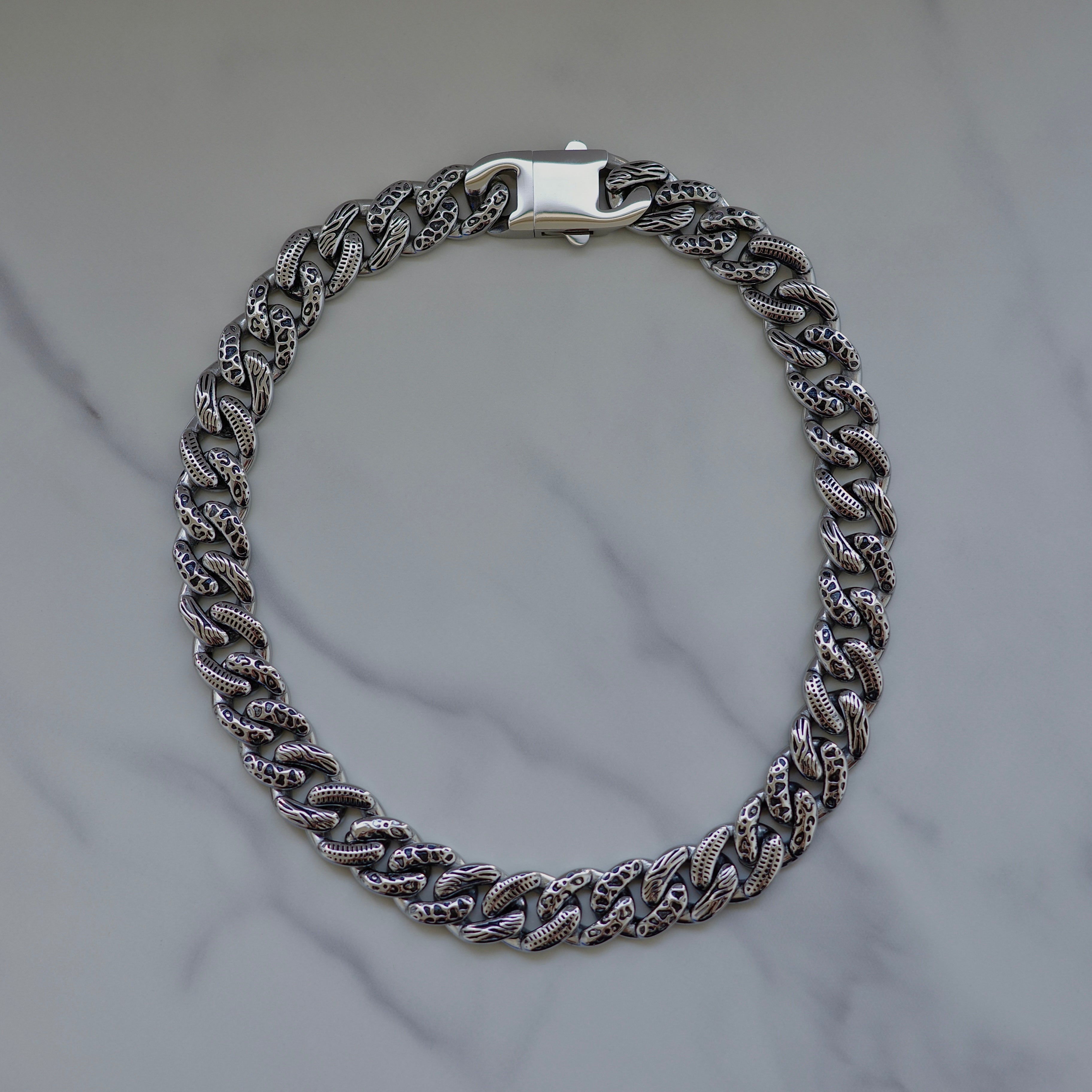 One of our craziest designs to date: Kuyashii's Animal Style Cuban chain features 4 different animal print engravings- Zebra, Cow, Crocodile and Cheetah with an antiqued finish. Features a double push clasp closure and Kuyashii logo engraving. Crafted from 100% solid stainless steel. Water safe. Can also be worn on reverse for a solid cuban look.